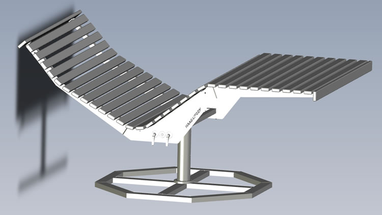 Die Himmelsliegen gibt es in Douglasie oder Lärche – die Untergestelle sind in Edelstahl & Aluminium oder pulverbeschichtetem Stahl verfügbar.